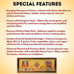 This powerful Combo Yantra Specially created for the Kitchen of your Home or Workplace for Annapurna Mata blessings, Kitchen Vastu Balancing and Good Vibes. It is a sacred mystical instrument that creates an unbelievable amount of energy around it and attracts positivity, health, wealth, positivity & more. As soon as the yantra is placed in your kitchen of your house or workplace, it will automatically generate positive energies, balance kitchen vastu dosh, and eliminates negative energy. These combinations help you bring positive energy and high energy of nourishment to an individual’s life & for all family members.