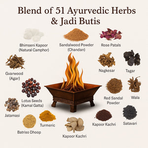 - Contains 51 Ingredients which also consists of Ayurvedic Herbs. Details of Contents: Made from Ayurvedic exotic herbs, Black Til, Jow, 30 types of dhoop, Bhimseni kapoor, Rose petals, Sandalwood powder, lobaan, ghee, chandan,Nagkesar,Tagar, Agar, wala, Red Sandal powder, Nagarmotha, Lotus seeds,Jata masi, Batriso Dhoop, Kapoor Kachri, Satavari,Turmeric.