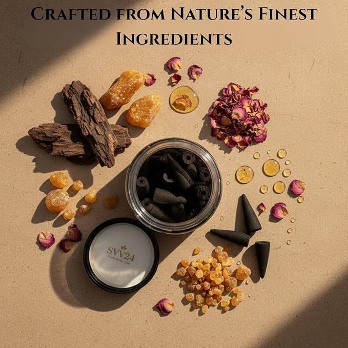 - SVV24 Oudh Dhoop Cones are 100% charcoal free and are available in 4 different fragrances – Arabic, Amber, Kasturi, and Rose.